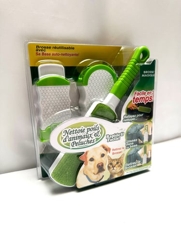 Cette brosse réutilisable élimine facilement les poils sur vêtements, tissus, sièges auto... Grâce à sa base auto-nettoyante, elle se nettoie en un geste : glissez-la dans son support, et elle est prête à réutiliser. Rapide, pratique et sans recharge.