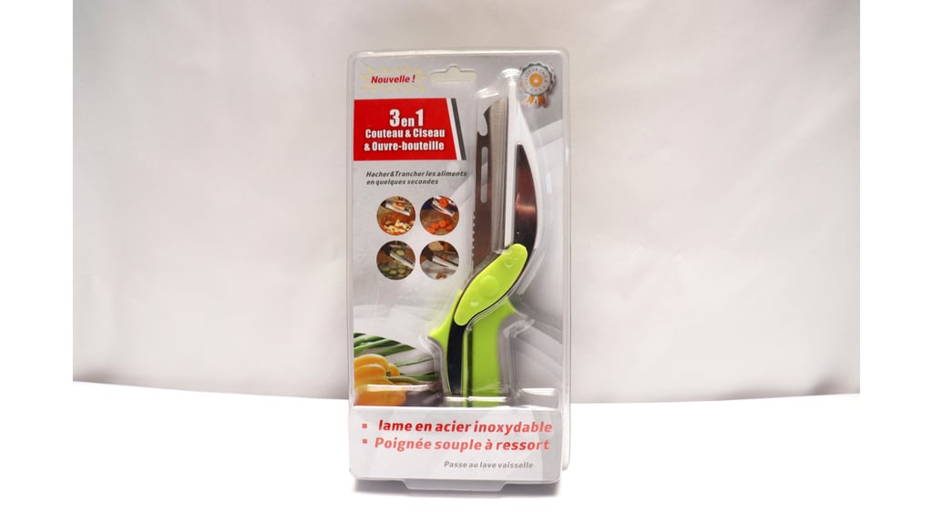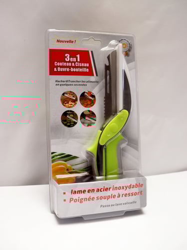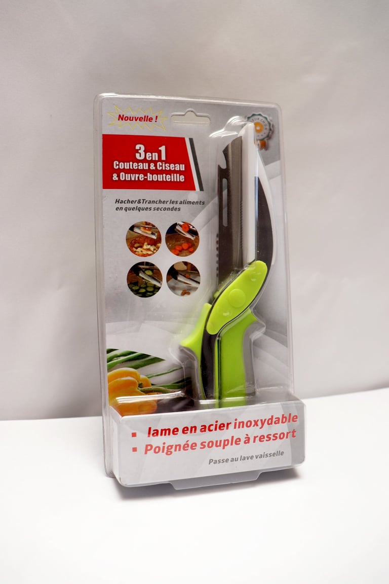 Ciseau 3 en 1 : couteau, ciseaux et ouvre-bouteille en un seul outil. Lame en acier inoxydable, poignée souple à ressort, passe au lave-vaisselle. Pratique et rapide pour trancher tous vos aliments !