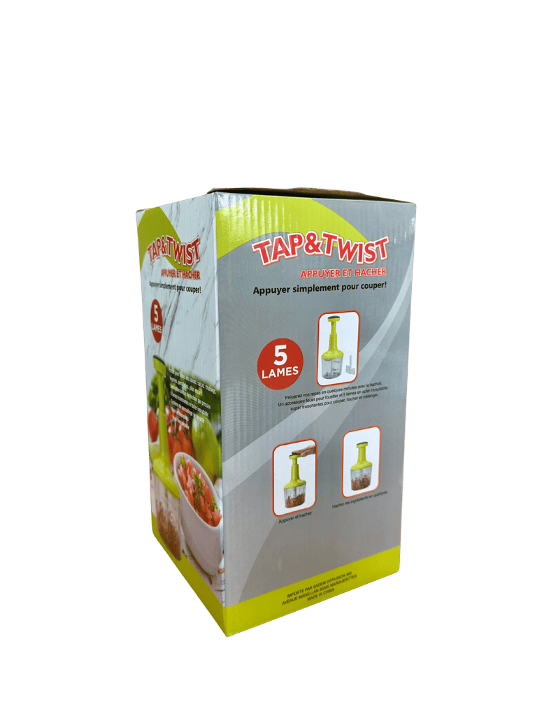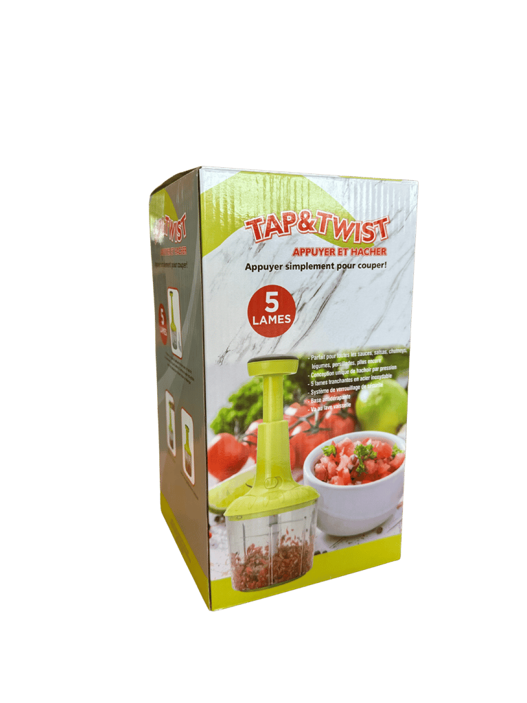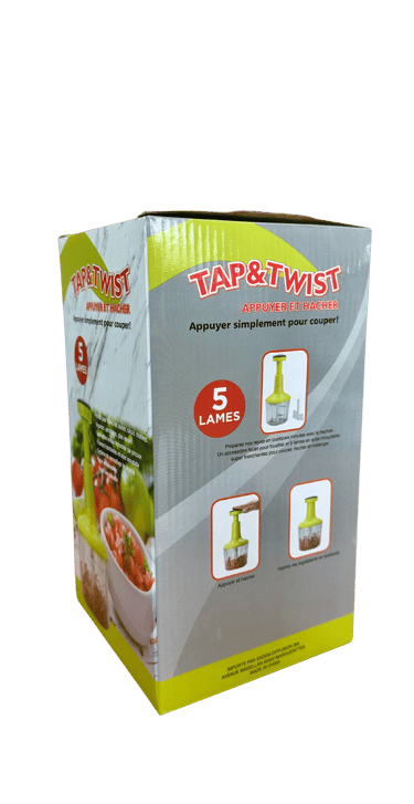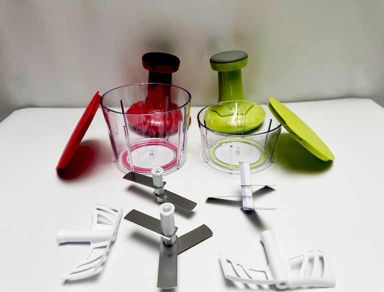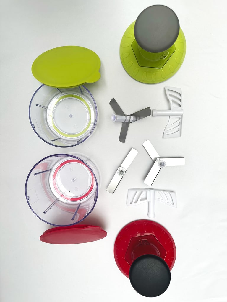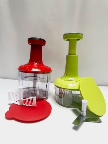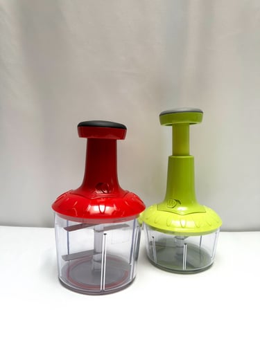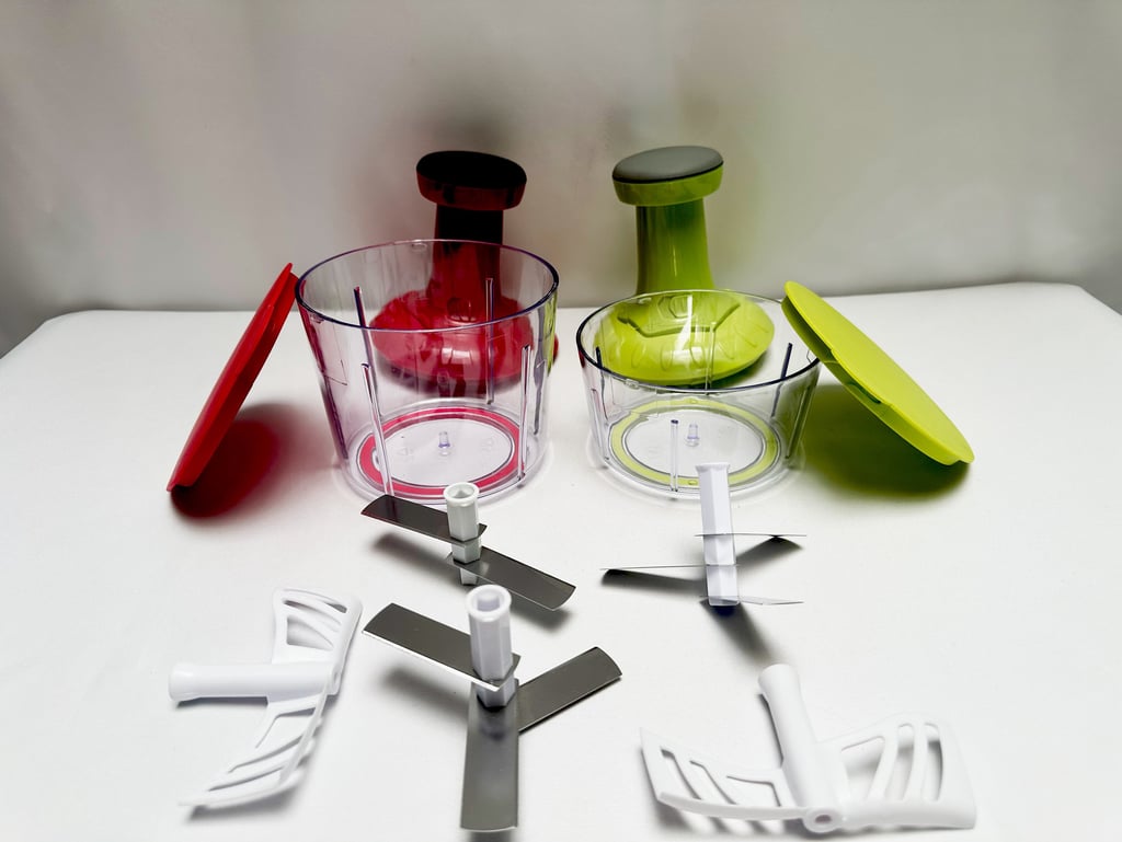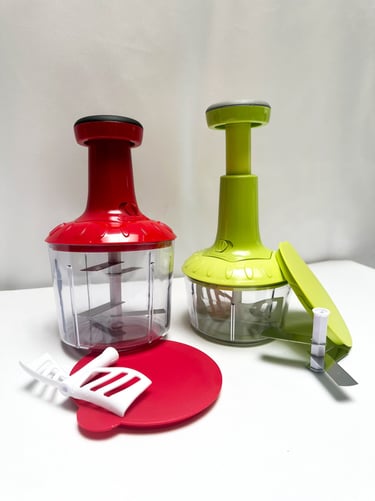 Ce duo de hachoirs manuels Tap & Twist permet de traiter différentes quantités selon vos besoins. Le petit bol est idéal pour les herbes et condiments, tandis que le grand convient aux légumes ou préparations plus importantes. Chaque modèle est fourni avec des accessoires.